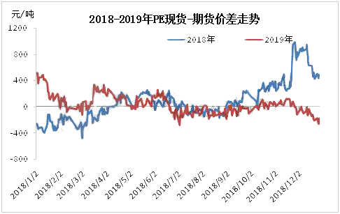 ????????2019年中國PE期現基差范圍較2018年縮窄,以華北煤化工7042價格與LL主力合約結算價基差來看,全年升貼水范圍在520元/噸以內,且基差多處于正值。2019年中國PE市場供需壓力加大,7-9月,中美貿易摩擦升級,市場擔憂情緒加重,現貨價格弱勢下行,并跌破十年歷史低位,此階段現貨端壓力大于期貨,基差處于負值。