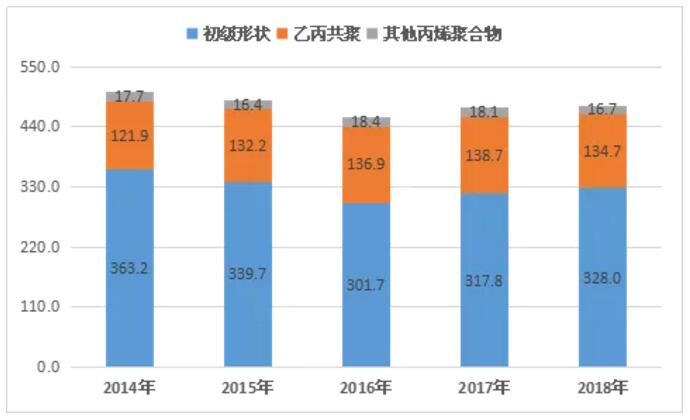 ????????2018年國內(nèi)聚丙烯粒料產(chǎn)量2027萬,進(jìn)口量479萬噸,出口量36萬噸,表觀消費量2471萬噸,比2017年增加103萬噸,增長4.3%;進(jìn)口依存度18.0%,比2017年下降0.6個百分點。