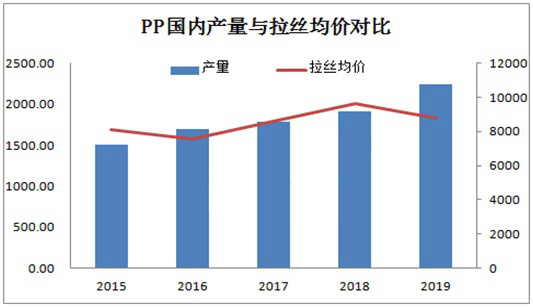 ????????國內(nèi)PP產(chǎn)量與拉絲均價呈現(xiàn)較為明顯反比趨勢,2016、及2018-2019年表現(xiàn)尤為明顯。2016年國內(nèi)PP產(chǎn)量經(jīng)歷了2014-2015年繼續(xù)擴張后,年產(chǎn)量高達(dá)1695.69萬噸,當(dāng)年國內(nèi)拉絲均價由2015年8090元/噸降至7570元/噸,降幅6.43%。2018年是近幾年產(chǎn)能增速相對較慢的一年,受整體擴能放緩且國內(nèi)大型企業(yè)檢修集中支撐,國內(nèi)拉絲均聚同比2017年漲幅12.7%。2019年1-10月份整體擴能202萬噸,均價同比2018年跌幅8.35%。