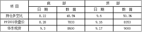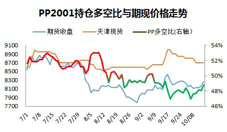 ????????第二、7月以來多空比曲線下行過程中,PP期現價格并不同步,多空比形成階段性底部和頂部相對領先,在50%臨界線之下,多單逐步增加,多空比逐步提升,此時配合基本面情況,有擇機介入短多的機會。多空比在8月22日達到階段性底部48.5%,之后開始一波反彈,多空比的底部領先期現價格一周左右時間,8月28日PP2001收盤7833元/噸,華東現貨在9月3日8600元/噸,相繼形成底部;9月6日,持倉多空比50.3%形成階段性頂部,且50%臨界線之上僅僅維持兩天就再次轉頭下行,此次多空比領先了期現價格10天左右??傊敹嗫毡?、期貨和現貨價格同向而行,“共振”之際,方可順勢而為。