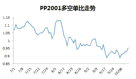 ????????放長時間看,自從2019年3月底到4月底,PP2001持倉多空比一直在50%臨界線之下,4月底到8月中旬,多空比在50%臨界線之上震蕩,8月中旬到目前在50%臨界線之下。跟基本面走勢并不吻合。當多空比與期現價格走勢產生背離時候,要提高警惕,分析原因并判斷真實方向。PP2001合約在9月份換為主力合約,太長時間的參考意義不大。