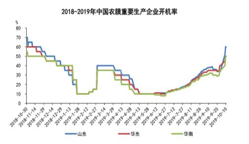 ????????隨著“金九銀十”農膜旺季逐漸到來,受節后需求增加的影響,終端用戶旺季買入意向增強,訂單有所增加,加之不受節日環保政策制約的影響后,部分小廠家重新啟動,因此全國農膜開工率出現明顯提升。目前全國農膜整體開機率在50%左右,山東地區農膜開工率提升至60%,一定程度上帶動了整體需求。