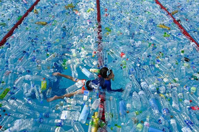 當(dāng)?shù)貢r間2019年6月8日,泰國曼谷,民眾在裝滿塑料瓶的游泳池里游泳,以紀(jì)念世界海洋日,警醒塑料污染。 (視覺中國/圖)