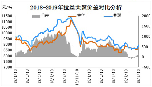 ????????2018-2019年PP拉絲、共聚在7-8月處于僵持低迷狀態,業者對長期成交疲態市場看空情緒明顯加重。商家因擔憂后市,低價甩貨明顯增多。9月市場受兩油庫存快速消耗及期貨連漲支撐,市場呈現絕地反彈局勢,拉絲與共聚價差逐步拉開距離。目前拉絲與共聚價差已經由原來持平狀態,擴大至100-200元/噸。根據目前拉絲與共聚成本價差計算,共聚高于拉絲300-400元/噸屬于正常價差,拉絲與共聚有價差有進一步擴大趨勢。