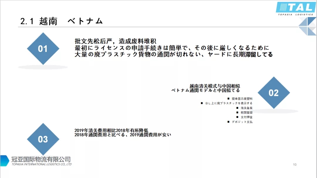 有批文的還是可以正常清關(guān),通關(guān)時(shí)間也很迅速。越南廢料的清關(guān)模式跟之前中國(guó)很像,提單必須顯示廢塑料,收貨人需要在海關(guān)備案,進(jìn)口報(bào)關(guān)的時(shí)間需要支付押金。現(xiàn)在問題是只有少數(shù)幾家船公司愿意接去越南的貨。相比2018年的情況,2019年下半年陸續(xù)出來很多新的批文,清關(guān)費(fèi)用也在逐步降低。