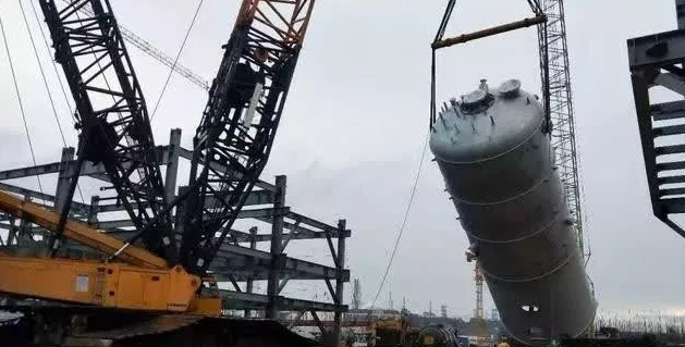 12月21日,福建百宏石化年產(chǎn)250萬噸精對苯二甲酸PTA項(xiàng)目的第一臺(tái)大型設(shè)備“第三CTA結(jié)晶器”順利吊裝成功。本設(shè)備凈重121.4t,直徑6.5米,高18.2米,主吊選用利勃海爾750噸履帶吊,溜尾選用180噸履帶吊。