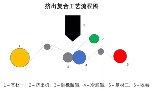 ????????擠出復合是將聚乙烯等熱塑性材料在擠出機內熔融后擠入扁平模口,成為片狀薄膜流出后立即與另一種或兩種薄膜通過冷卻輥和復合壓輥復合在一起。與其他復合方法相比,擠出復合具有設備成本低、投資少、生產環境清潔、復合膜可以不存在殘留溶劑、生產效率高、操作簡便等優點,擠出復合在塑料的復合加工中占有很重要的位置。擠出復合膜可以用擠出涂覆和擠出復合兩種方法制得。