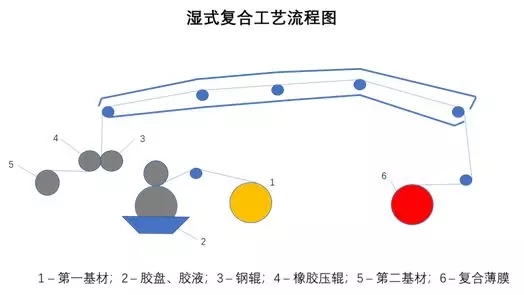 ????????濕式復合是在復合基材(塑料薄膜、鋁箔)表面涂布一層膠粘劑,在膠粘劑未干的狀況下,通過壓輥與其他材料(紙、玻璃紙)復合,再經過熱烘道干燥成為復合薄膜。濕式復合的特點是工藝操作簡單,膠粘劑用量少,成本低,復合速度快。濕式復合法采用的膠粘劑主要有聚乙烯醇、硅酸鈉、淀粉、聚乙酸乙烯、乙烯-醋酸乙烯共聚物、聚丙烯酸酯、天然樹脂等。濕式復合機工作原理與干式復合基本相似,所不同的是干式復合是將涂布膠粘劑的薄膜經過烘道加熱,待膠粘劑中有機溶劑揮發后,再與復合材料熱壓粘合;而濕式復合法是將涂布膠粘劑的薄膜直接與復合材料復合后,再進入烘道進行干燥。