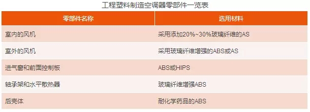 ????????空調(diào)一般分為室內(nèi)機和室外機兩部分。室內(nèi)機所用塑料占到總重量的30%以上,其中使用最廣泛的是ABS和HIPS。空氣過濾器是由PP纖維在PP支架上圍織,排水管用軟質(zhì)PVC擠出。室外機殼體已經(jīng)逐漸采用塑料代替鋼板,其中進(jìn)氣窗和控制板采用HIPS制備,貫流風(fēng)機部件采用玻纖增強ABS,室外機殼體目前采用耐候PP制備。