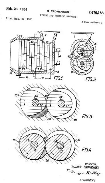 ????????1950年代,有了數年的研究積累,W. Meskat和R. Erdmenger等人把雙螺桿擠出機的一些關鍵性參數進行定義并整理,使擠出機的理論研究走向規范化。下為數篇專利中的一篇,可以看出,當時的擠出機已經以單頭元件為主,專利中還公開了嚙合元件的應用。