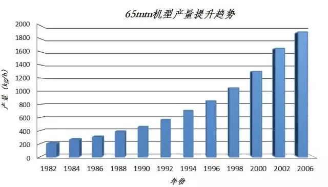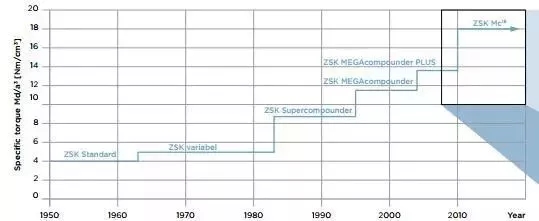 ????????由圖可以看到,以65mm機型為例,從1980s到2000s,將近20年時間里產量提升了近10倍。比扭矩從ZSK第一代的4Nm/d3已發展到18+ Nm/d3,大小徑比從1.22提高到1.80,物料的平均停留時間也由數十分鐘降低到了僅僅數十秒。