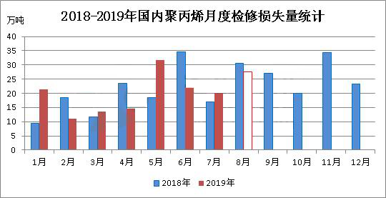 ????????2019年8月份,國內聚丙烯檢修損失量預計在27.63萬噸,環比(2019年7月份20.12萬噸)增加7.51萬噸,增幅在37.33%;同比(2018年8月30.66萬噸)減少3.03萬噸,減少9.9%。2019年1-8月份,預計累積檢修損失量為162.15萬噸,較去年同期(2018年1-8月164.11萬噸)略有減少,降幅1.2%。