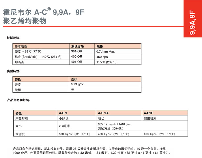 - 霍尼韋爾 AC® 9 低密度聚乙烯 (LDPE) 均聚物 物性表, 霍尼韋爾 AC® 9 低密度聚乙烯 (LDPE) 均聚物 產品參數,霍尼韋爾 AC® 9 低密度聚乙烯 (LDPE) 均聚物 性能表,霍尼韋爾 AC® 9 低密度聚乙烯 (LDPE) 均聚物 出廠報告, MSDS,, 物質安全資料表, UL黃卡,{ SGS報告, RoHS, 食品級認證, NSF飲用水標準, 產品資料, 產品性能, 出廠報告, 原廠原包, 代理商, 熱變形溫度, 熔指數, 流動系數, 抗沖擊性能、沖擊強度, 低溫韌性、低溫抗沖擊性能, 熔體流動系數、熔體流動速率, 加工工藝、加工參數、加工溫度, 歐盟RoHS 德國FDA 美國FDA 日本FDA