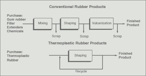 熱塑性彈性體可以反復(fù)加工的特點,決定了它優(yōu)于熱固性橡膠的主要優(yōu)越性。兩者在加工方面的其它關(guān)鍵性區(qū)別如下表所示。